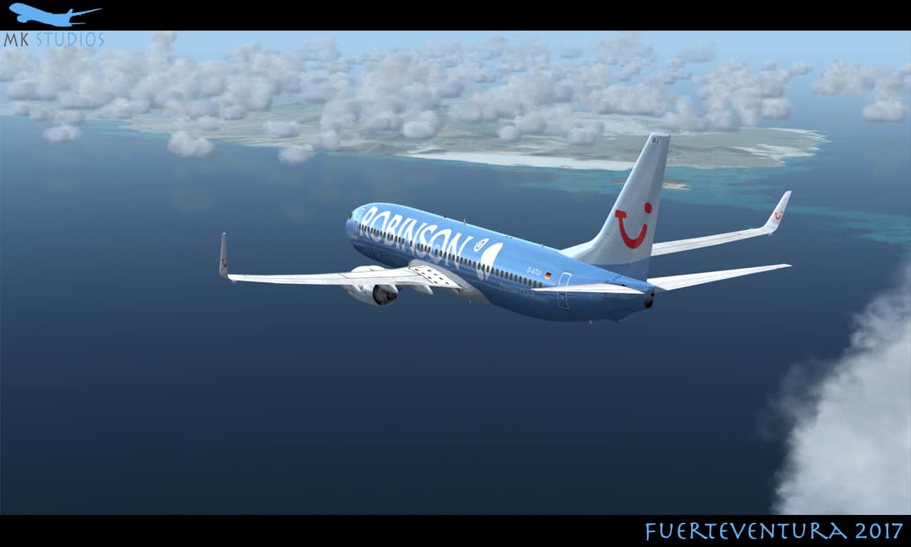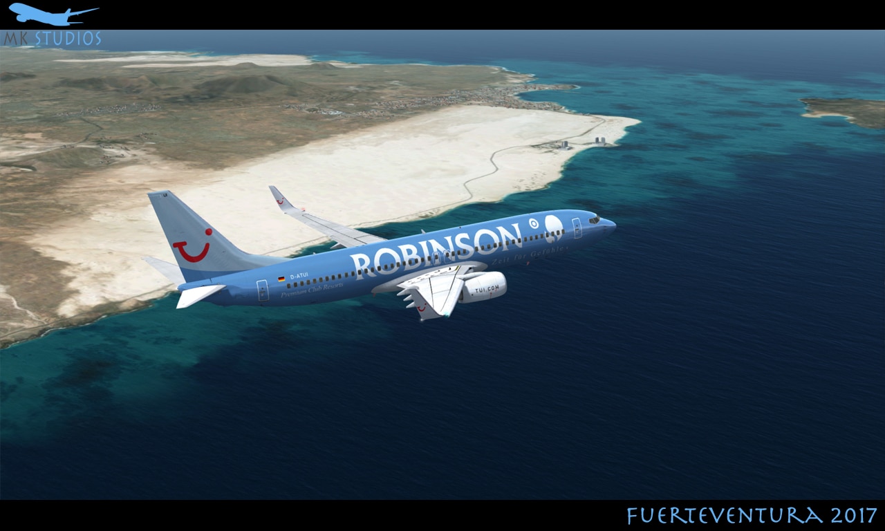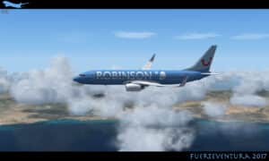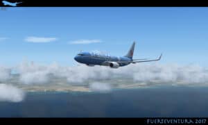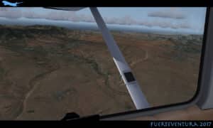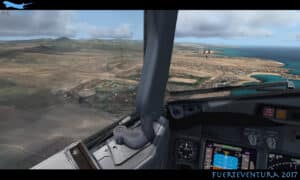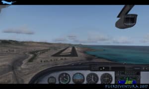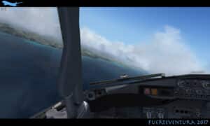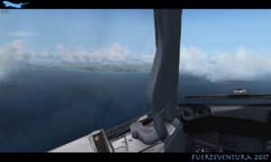 Von meinem Heimathafen Hamburg sind es ca. viereinhalb Flugstunden bis nach Fuerteventura. Nach dem Überfliegen von Frankreich und Spanien geht es hinaus auf den Atlantischen Ozean, bis nach ungefähr vier Stunden zunächst die Insel Lanzarote vor dem Cockpitfenster auftaucht. In der Realität überwiegend von dunklem Vulkangestein bedeckt sieht sie im Simulator alles andere als natürlich aus. Kurz darauf kommt die Nordspitze Fuerteventuras in Sicht, die Dank der mitgelieferten Fototapete sehr viel ansprechender aussieht. Windbedingt steht eine Landung auf Piste 01 an, sodass der Flug zunächst einmal am Airport vorbei wieder weiter hinaus aufs Wasser geht. Danach wird zurück nach rechts gedreht und die Piste schließlich von Süden her angeflogen.