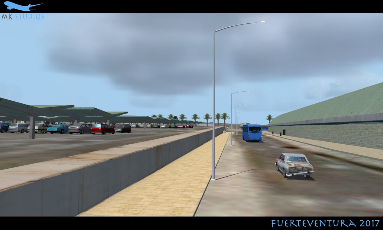 Der landseitige Bereich des Terminals ist relativ schmucklos. Hier gibt es ein paar Parkplätze und einen Ankunftsbereich für die Busse, die die Touristen zu ihren Hotels bringen. Das Luftbild, was im Bereich des Flughafens verwendet wurde, ist leider nicht besonders hoch aufgelöst, sodass diese Seite des Terminals recht schmucklos wirkt. Aber im Normalfall bekommt man diese Seite beim Fliegen ja auch nicht zu Gesicht.