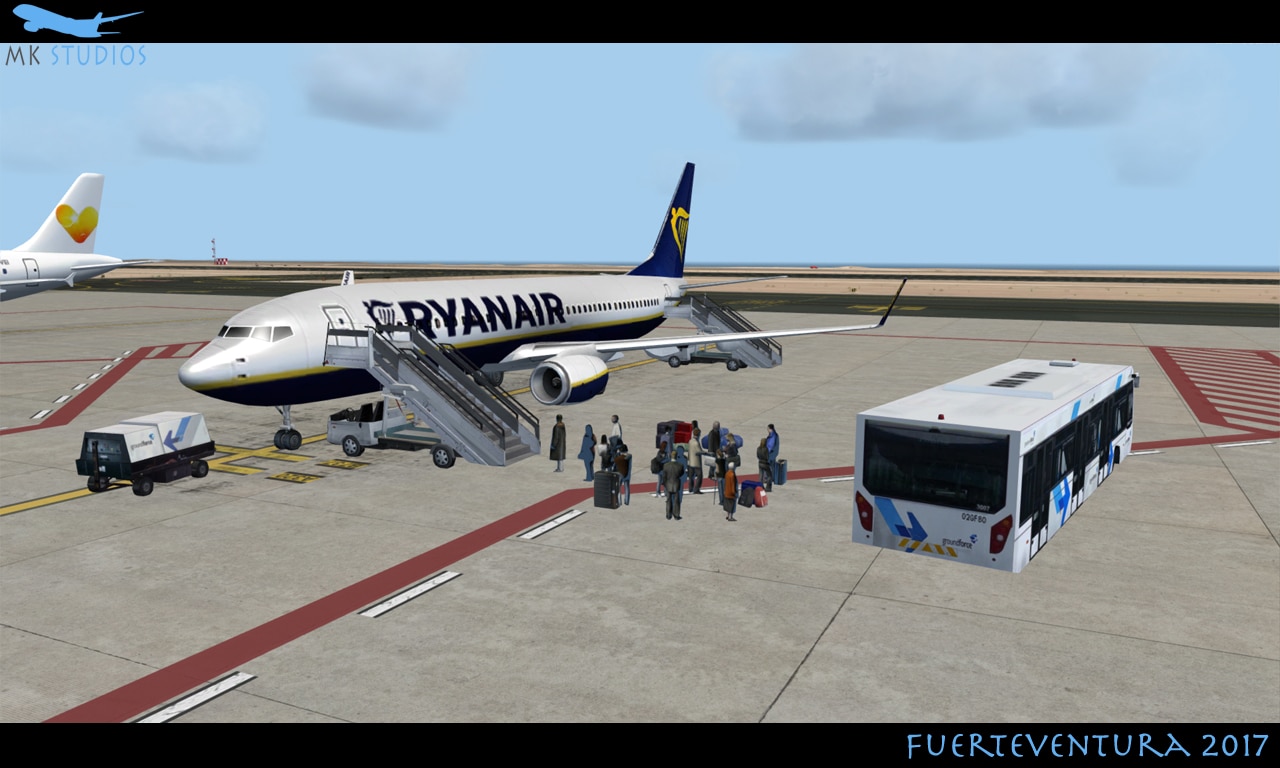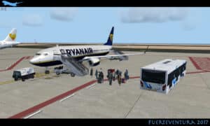 Ebenfalls positiv finde ich, dass MK Studios die Möglichkeit bietet ein paar statische Flugzeuge auf dem Vorfeld zu platzieren. Das ist nicht nur für Online-Flieger interessant. Denn zu den Flugzeugen gibt es auch noch ein bisschen „Leben“ dazu. Neben einer Maschine von Ryan Air steht ein Bus, der gerade einige Passagiere ausgeladen hat und die nun darauf warten, das Flugzeug besteigen zu können. Das ist wirklich nett gemacht.