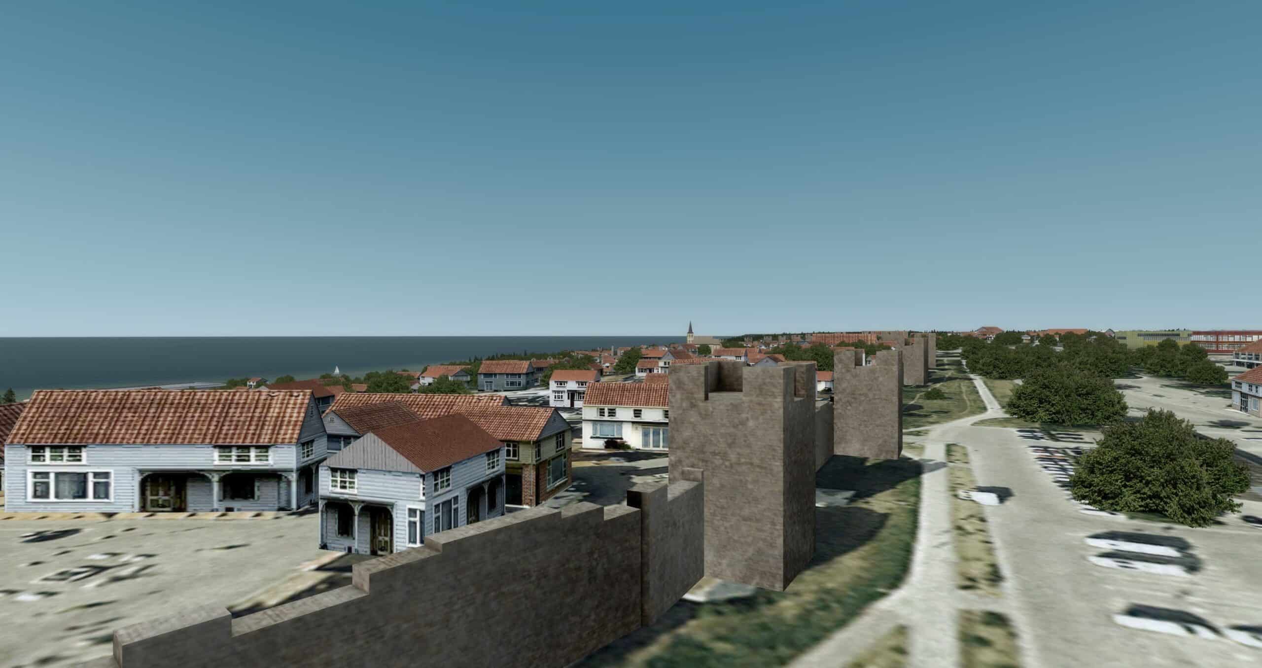 Visbys markante Gebäude sind die Stadtmauer und der Dom. Natürlich sind sie modelliert, und es gibt noch ein paar andere 3D-Modelle, die auf der Fototapete stehen.