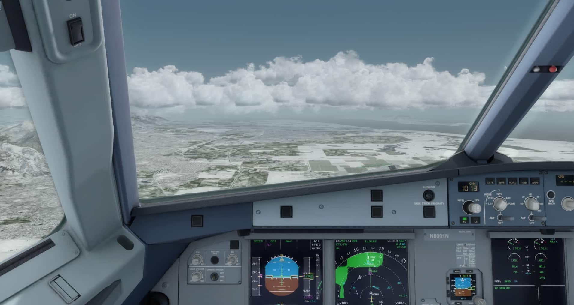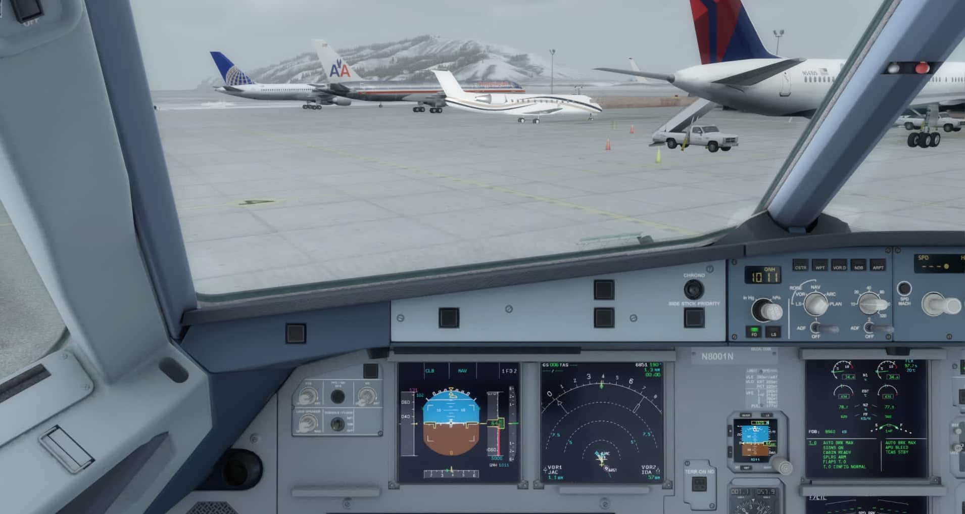 Für einen ersten Eindruck fliege ich gerne aus einem nicht allzu weit entfernten Flughafen an, bevor ich mich an die Detailaufnahmen mache. Wie oben schon genannt liegt Salt Lake City nicht weit von Orbx Jackson Hole entfernt – das passt doch ganz gut! Laut FlightAware fliegt Delta die Strecke bis zu dreimal täglich mit A319 – auch das passt, außer, dass mein A319 sich heute als American Airlines verkleidet hat, weil die passende Livery nicht installiert ist.