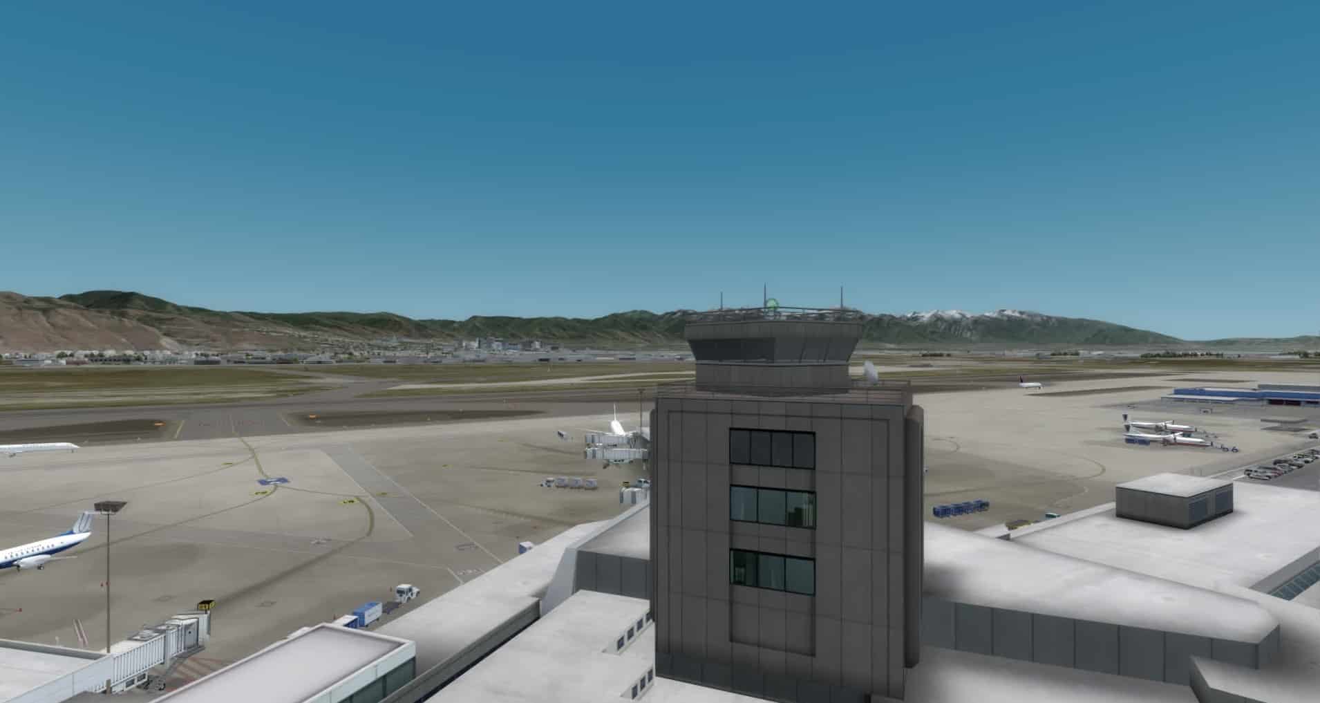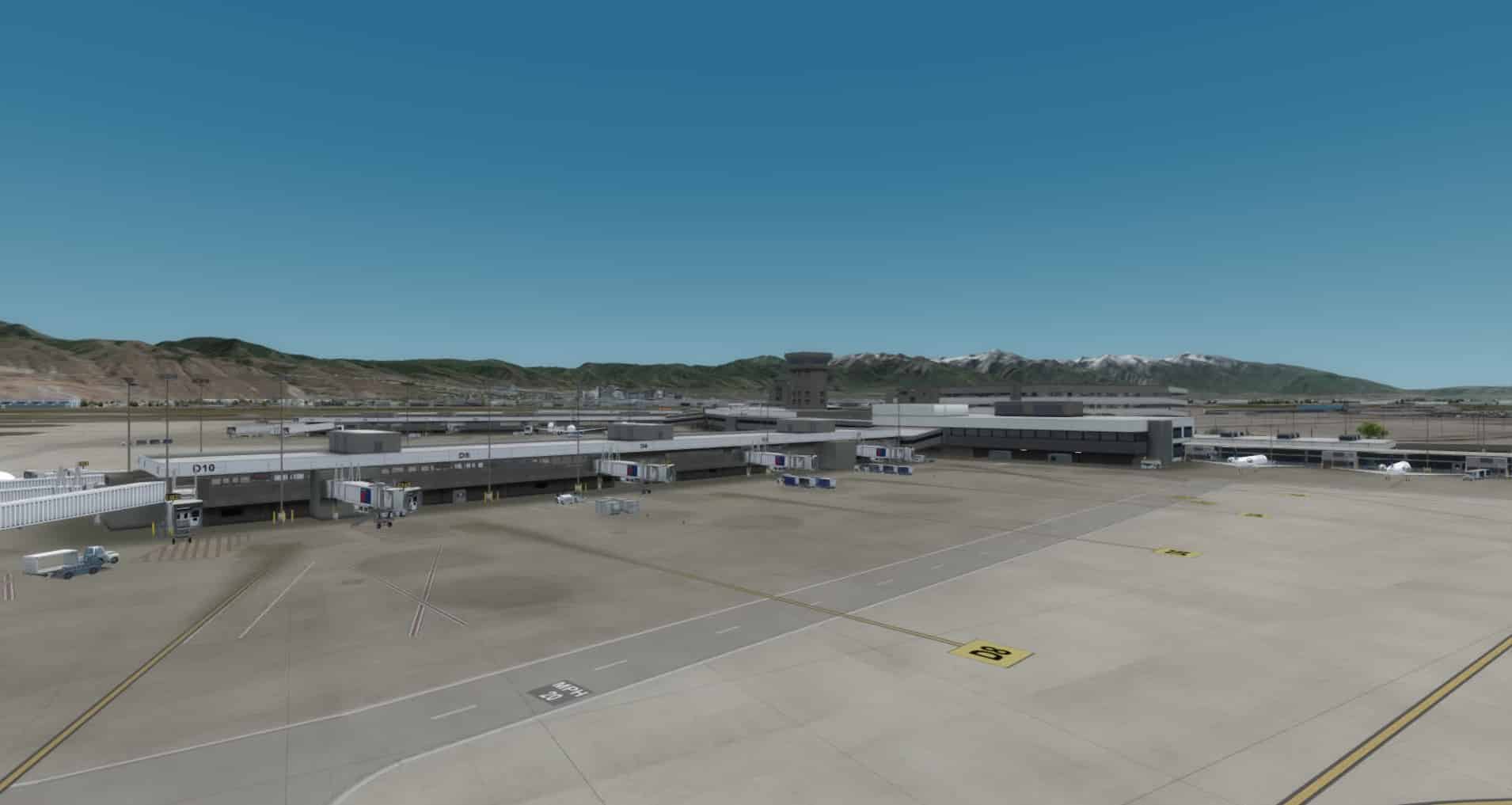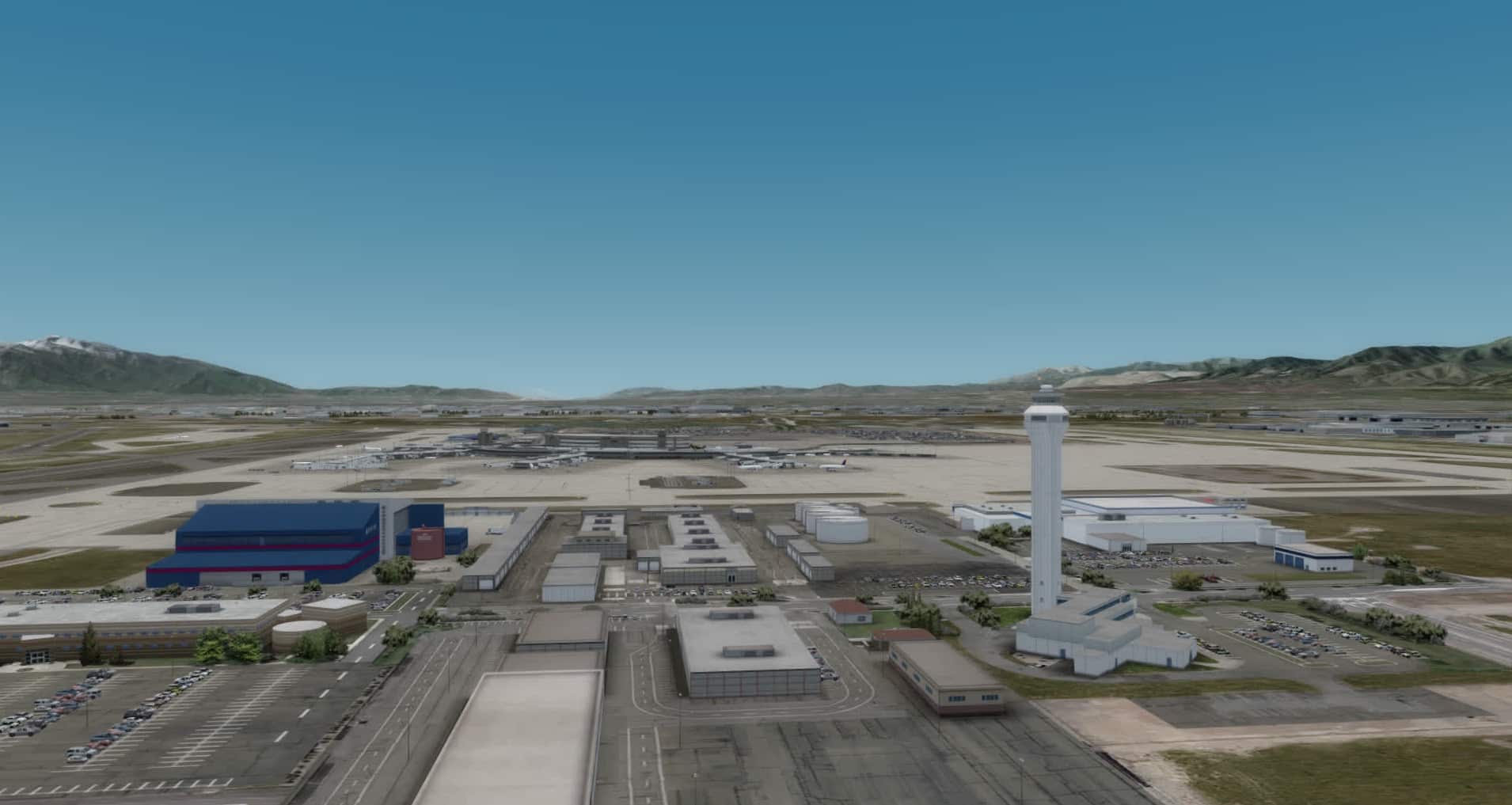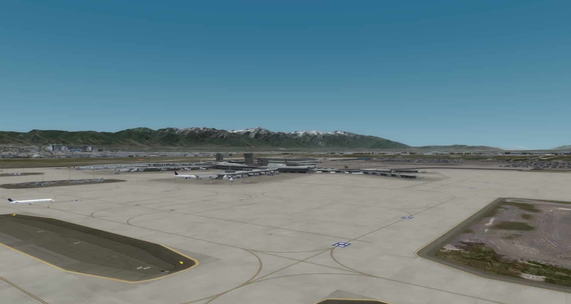 Der örtliche Flughafen trägt den wenig phantasievollen Namen Salt Lake City International Airport. Er fertigt jährlich etwa 20 Millionen Passagiere ab (zum Vergleich: Frankfurt 60 Mio.), verfügt dafür über 3 Terminals, und – ungewöhnlich für einen derart großen Verkehrsflughafen – einen relativ großen General Aviation-Bereich. Der Verkehr wird mit vier weitgehend parallelen Bahnen abgewickelt. 16L/34R und 16R/34L sind 3,7 km lang, östlich davon liegt die ca. 3 km lange Bahn 17/35. Neben diesen großen Bahnen gibt es noch die 14/32 mit 1,5 km Länge. Aus Gründen des Lärmschutzes wird der Verkehr hier bei geeigneten Windverhältnissen aus und nach Norden abgewickelt (siehe hier), ein Konzept, das sich im FSX/P3D nur schwierig nachbilden lässt.