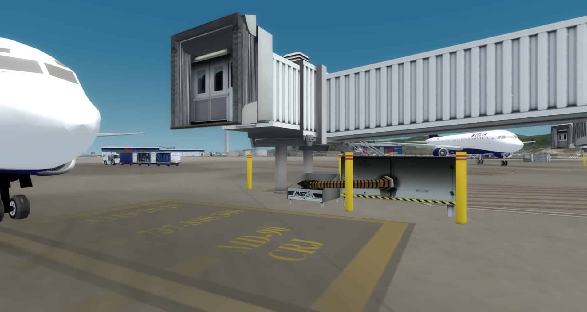 Mir fallen die eigenartigen Schrifttypen der Flugzeugbeschriftungen am Boden auf, deren Echtheit lässt sich leider bei Google Earth nicht verifizieren. Die Jetways sind, wie schon gesagt, durch SODE beweglich. Die Detailllierung der Jetways und generell der Objekte im Bereich des Terminals ist ausreichend, aber nicht detailverliebt (ein typischer PacSim-Stil, der zu einer relativ hohen Performance führt).