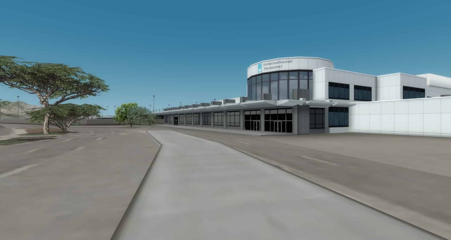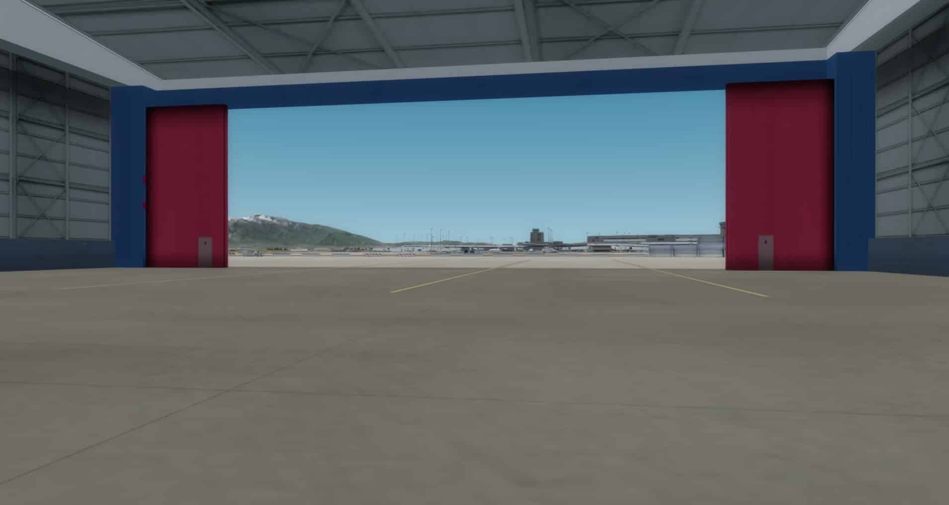 Zeit, den Flughafen mal im Detail zu betrachten – die Umgebung und ein paar weitere Flugideen kommen später. Weil neulich die Diskussion über Fotos in Reviews aufkam ein paar Informationen zu meinem Workflow: ich nutze sehr gern Orbx’s kostenloses Addon „BOB“, mit dem man zu Fuß die Gegend erkunden kann, um Fotos zu machen – so ist nämlich kein störendes Cockpit oder Flugzeugmodell zu sehen. Und idealerweise schwebe ich damit per Grobverstellung über die Szenerie. Bilder kommen direkt aus dem Simulator über die V-Taste, Videos aus nVidia’s Shadowplay. Beides geht durch FFMEG zur Komprimierung, und die Wahl des Bildausschnitts mache ich über Aperture auf dem Mac. Deshalb haben meine Bilder auch immer so krumme Auflösungen, denn aus den 1920×1080-Bildern müssen ja noch Fensterrahmen, Textinformationen und dergleichen entfernt werden. Neben dem Beschneiden bearbeite ich nicht nach.