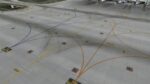 Aufwendig umgesetzt sind auch die Oberflächen der Terminalvorfelder. Wie auf deutschen Großflughäfen üblich, besitzt auch München blaue und orange Taxiways, die von Maschinen mit kleineren Ausmaßen anstatt des zentralen Tayiway genutzt werden können. Die verschiedenen Farben sind gut dargestellt, Markierungen sind durchweg klar lesbar und diverse Nutzungsspuren sind über das Apron verteilt – übrigens auch am neuen Satellitengebäude.