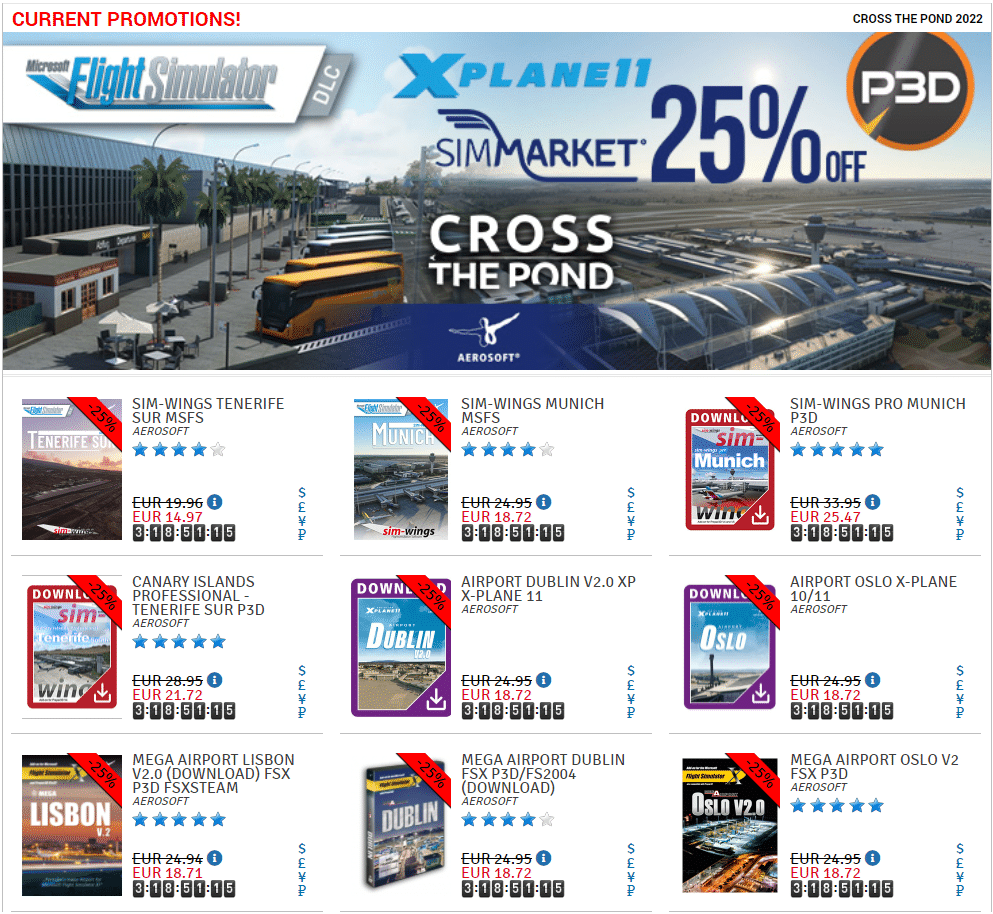 Auch bei Aerosoft gibt’s einen SimWings-Sale mit 25% auf diverse Sceneries für MSFS, X-Plane und Prepar3D: