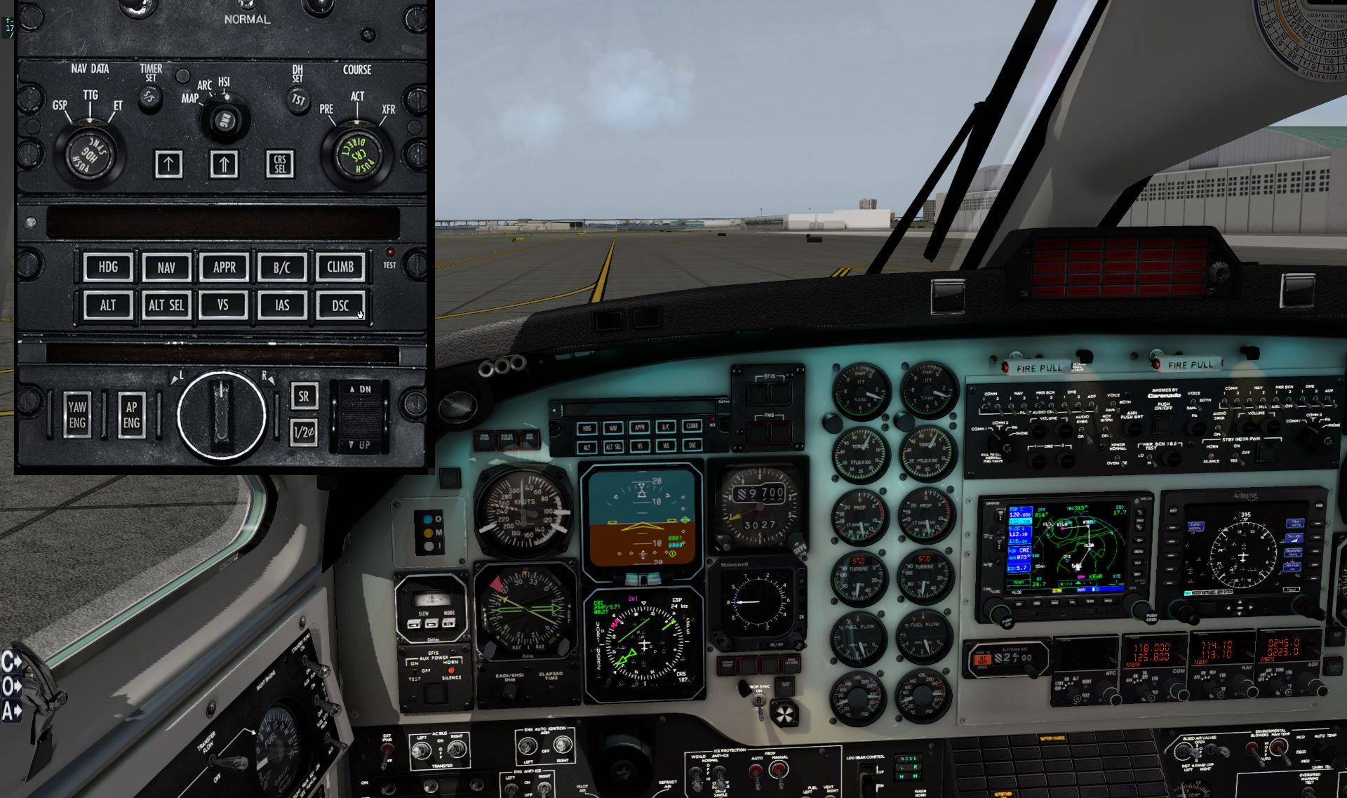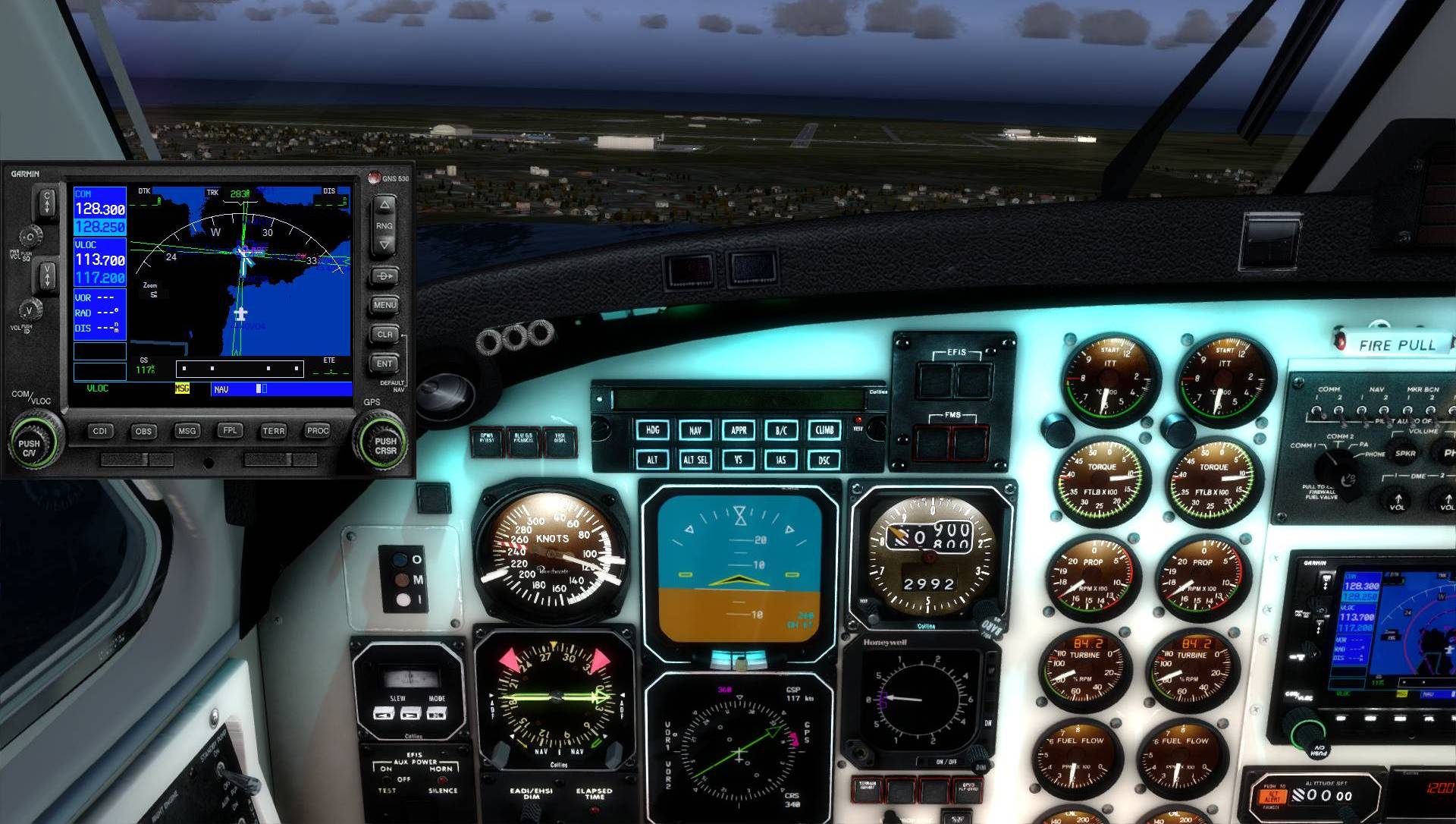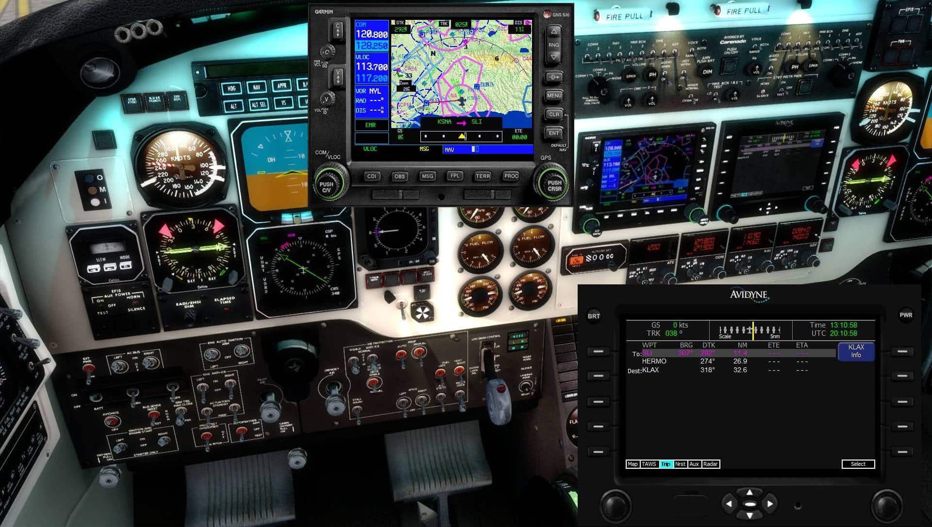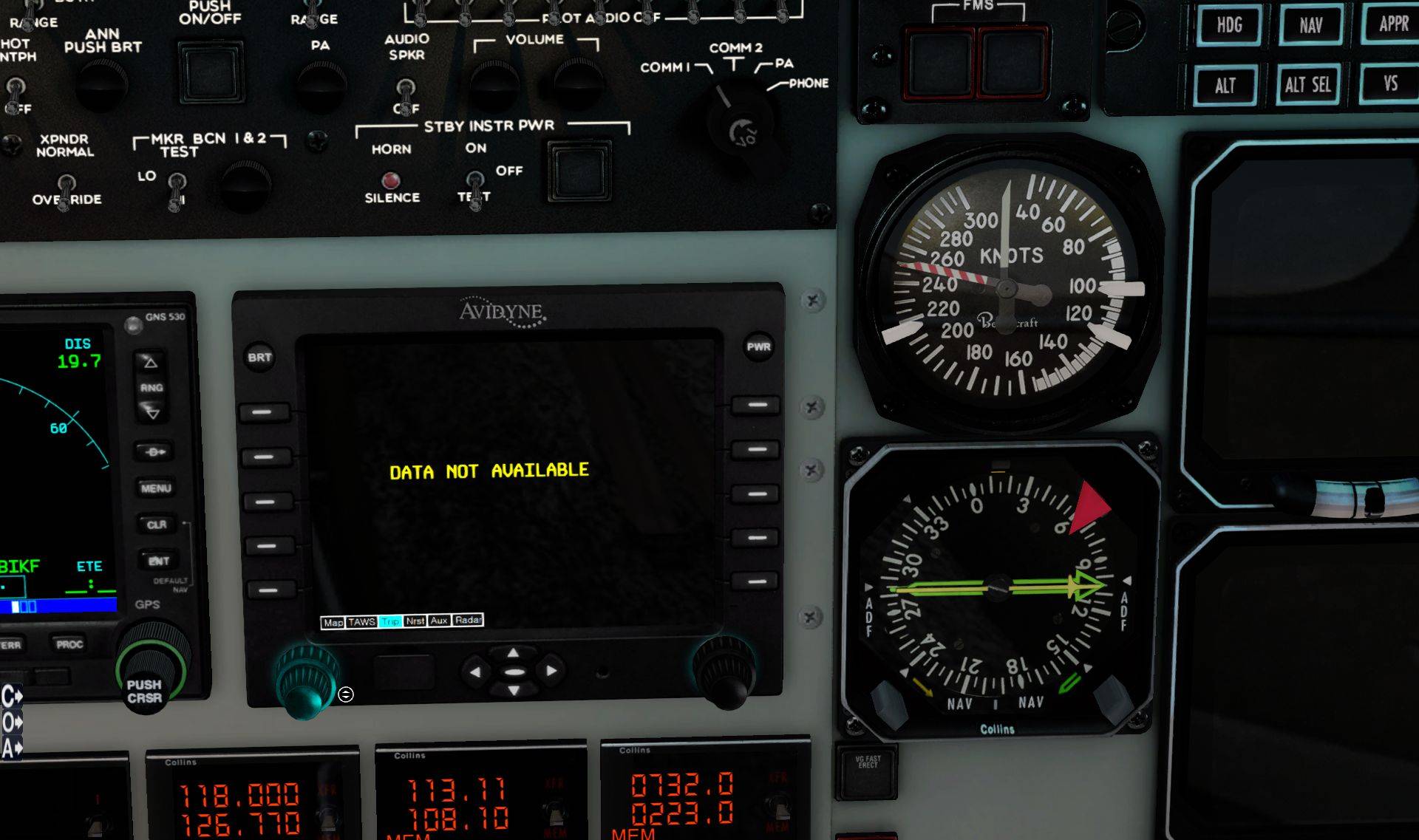 Wo hingegen die P3D Fassung deutliche Vorteile hat, ist bei der Avionik. Sowohl das GPS, wie auch das Avidyne beherrschen die Terrain-Darstellung und auch bei den nächsten Airports und Flugplänen kann das P3D Avidyne sich eindrucksvoll in Szene setzen. Auf der X-Plane Seite kommt bei diesen Punkten eher eine Fehlermeldung oder Versionsinformationen. Außerdem kann man bei der P3D Maschine fast jedes Instrument in ein eigenes Fenster verlegen, das man beliebig verschieben kann. Unter X-Plane geht dies nur mit dem GPS und dem Autopiloten (den man mit dem A am linken Bildschirmrand aufrufen kann). Die P3D kann zu allem Überfluss auch noch mit einem FMC aufwarten, das allerdings funktional keine Rolle spielt, denn alles was dieses Gerät kann, macht auch das eingebaute GPS. Es ist außerdem nicht wirklich realistisch, zumindest ist keine B1900D bekannt, der man je ein FMC nachgerüstet hätte.