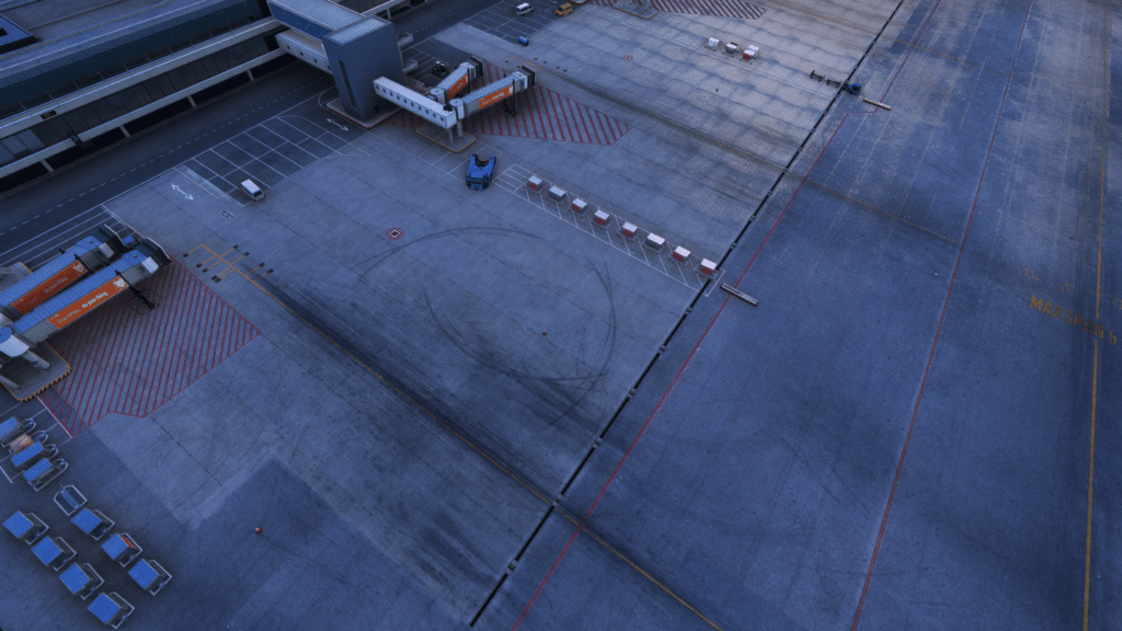 Der ganze Flughafen wurde mit passenden Texturen versehen, auf dem Apron sind Verschmutzungen, sowie Gebrauchsspuren zu sehen. Alle Lande- und Startbahnen haben die passenden Texturen bekommen, und sehen einfach klasse aus. Die Bodenmarkierungen sehen alle makellos aus, und sind prima umgesetzt. Dazu wurden alle Linien klar dargestellt, und die roten und blauen Linien sind vorhanden.