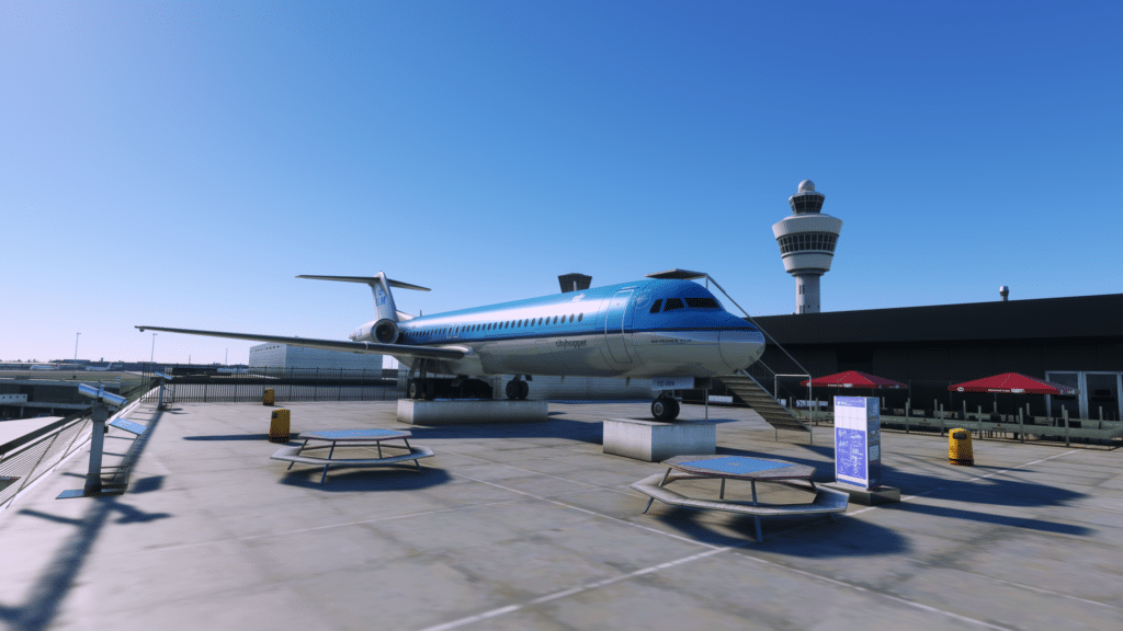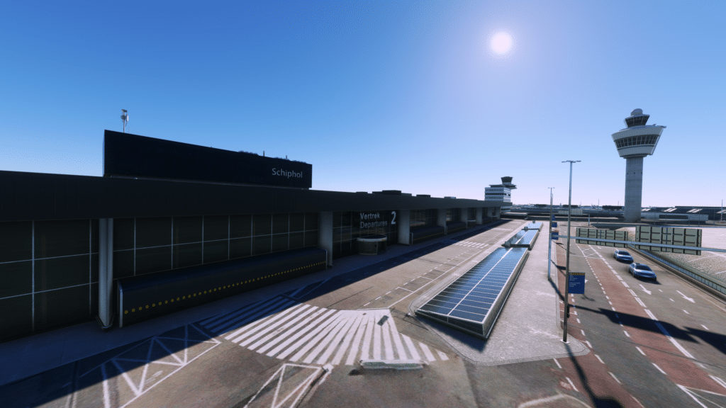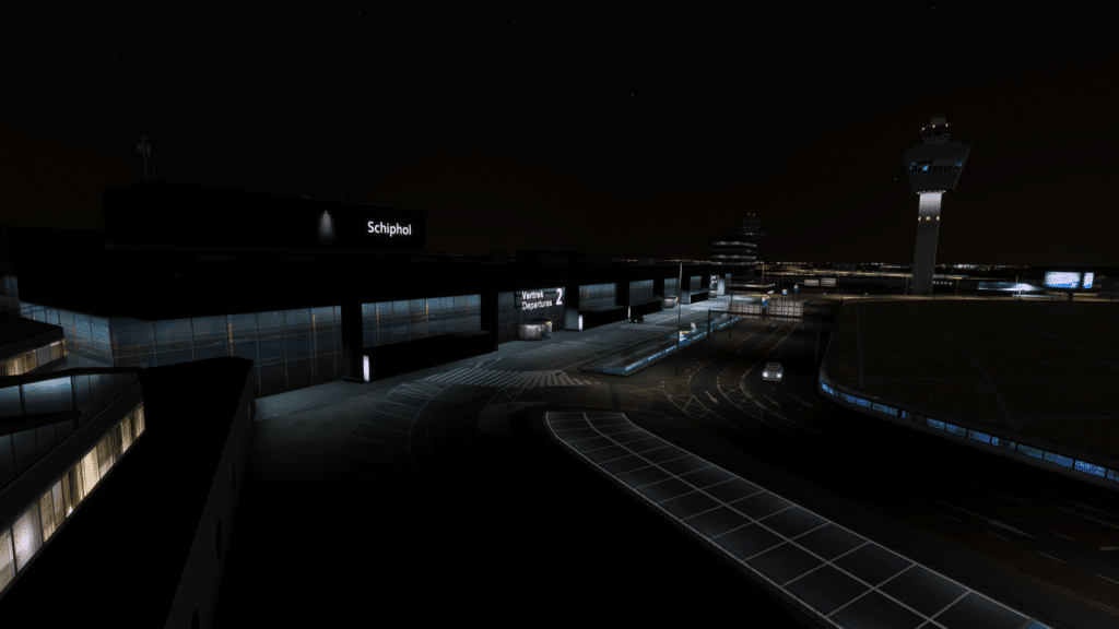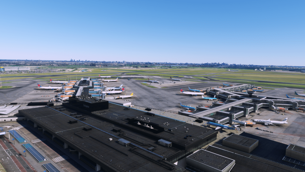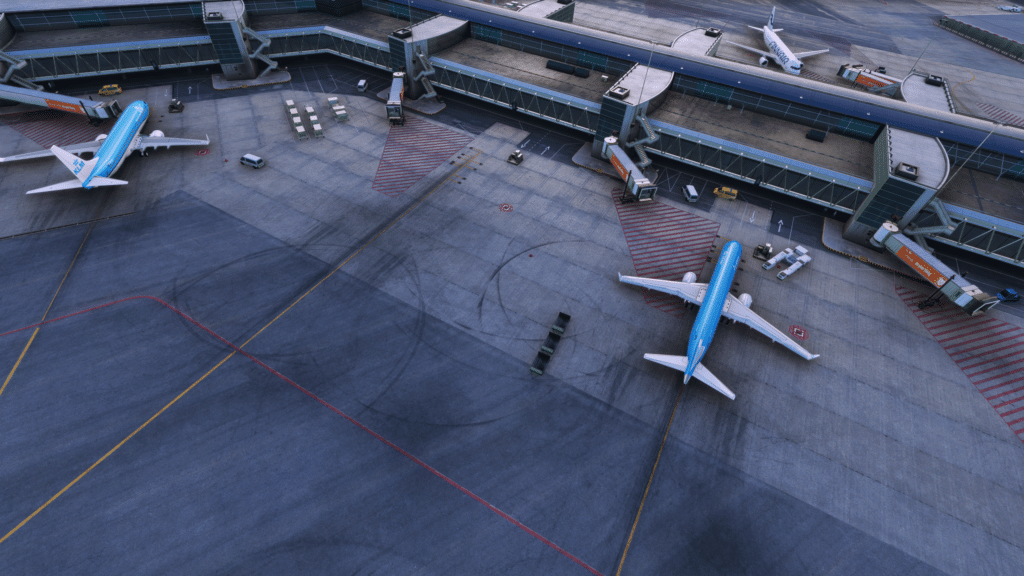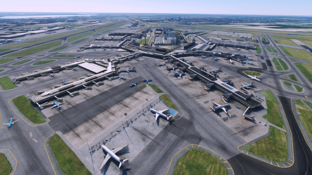 Alle Terminals wurden dargestellt, und weitreichend mit Interieur ausgestattet. Von außen sehen die Terminals klasse aus, wichtige Details wurden dargestellt, die Texturen sind alle scharf, und wurden auch mit dem richtigen Maß an Abnutzung ausgestattet. Die Fenster wurden mit Variationen gebaut, so sieht man an manchen Fenstern eine Jalousie und an anderen nicht. Lichtmasten für die ausreichende Beleuchtung bei Nacht wurden gebaut und ausreichend detailliert dargestellt. Auch die Straßen für die Bodenfahrzeuge wurden dargestellt, und gut integriert. Das Interieur wurde in fast alle Terminals integriert. Das Interieur ist nicht perfekt dargestellt, aber erfüllt seinen Sinn und Zweck, und schont die FPS an diesem Mega-Airport. Dazu wurden Plätze wie die Besucherterrasse detailliert dargestellt, und sogar die Fokker 100 der KLM Cityhopper hat es in den Simulator geschafft. Zusammenfassend zu sagen, wurden die Terminals ausreichend detailliert und akkurat dargestellt, sodass eine gute Darstellung geschaffen wurde.