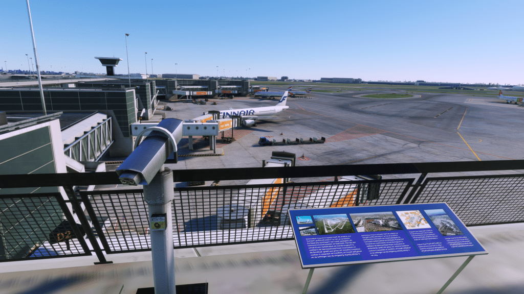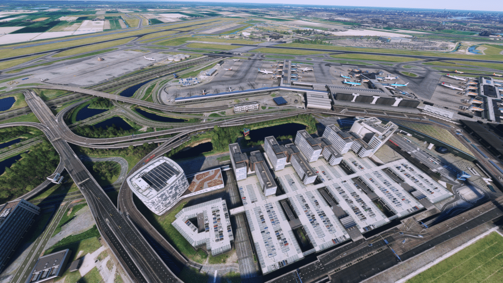 Der Flughafen im Überblick macht einen sehr guten Eindruck. Alle wichtigen Gebäude wurden visualisiert und gut dargestellt. Die Orthos haben eine klasse Auflösung und alles ist zu erkennen. Der komplexe Flughafen wurde gut dargestellt, alle Terminals sind dargestellt, alle Rollwege vorhanden, und die Start- und Landebahnen gut dargestellt. Alle Straßen, wurden inklusive allen Rollbrücken dargestellt, dazu wurden Parkhäuser inklusive Autos gebaut. Im Allgemeinen eine perfekte Darstellung von oben.