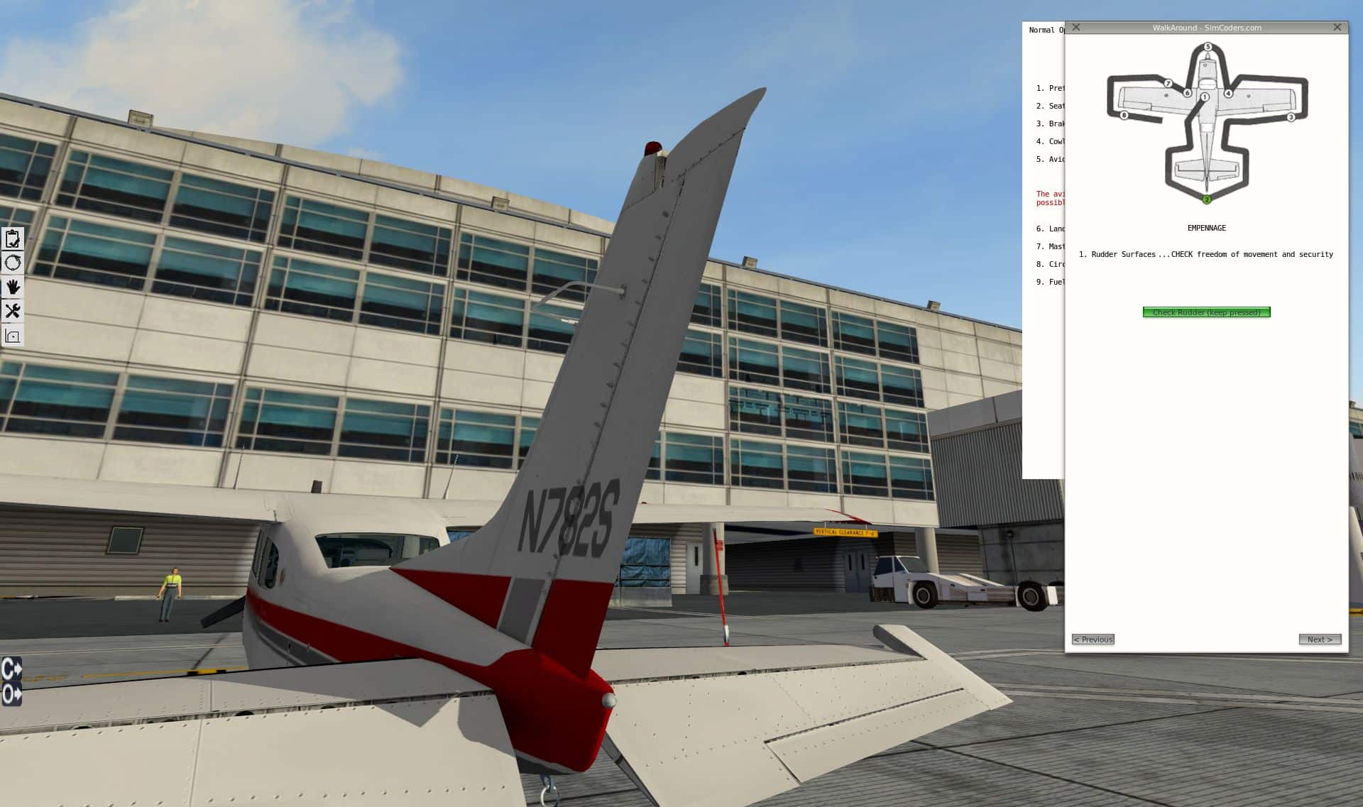 So kann man ähnlich wie bei der AirFoilLabs C172 oder den A2A Flugzeugen einen Außencheck durchführen (wobei man jedoch ähnlich A2A nur durch die verschiedenen Punkte durchklickt, man geht nicht wirklich um das Flugzeug wie bei AirFoilLabs) und das Flugzeug per Hand ziehen.
